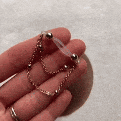 A pair of adjustable barbell style fake nipple piercers. Avoid pain and discomfort caused by piercing, safer and more hygienic. Made of food grade silicone band and 18K gold plated beads,