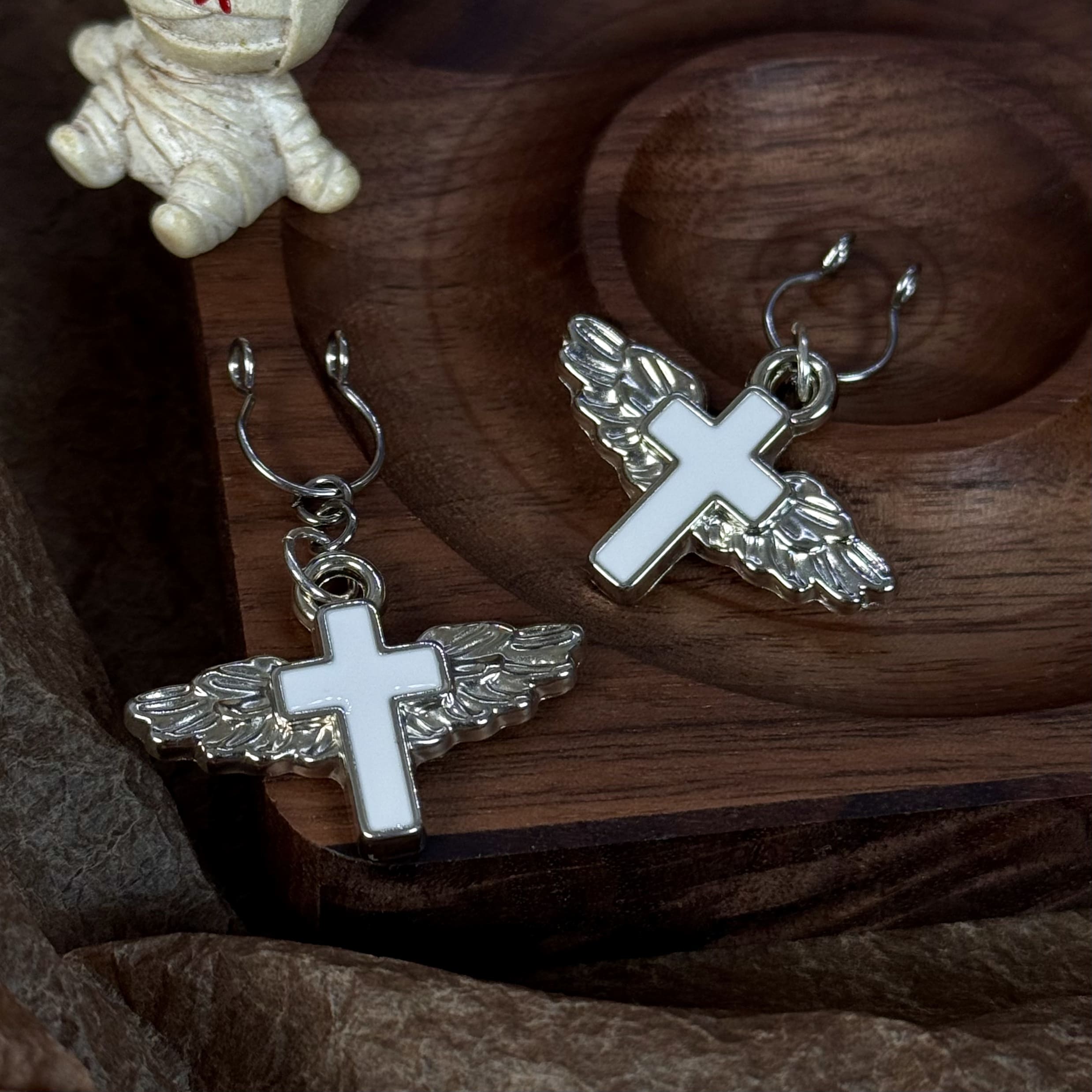 This silver horseshoe-style adjustable nipple clamp features a cool metallic finish paired with a white cross-and-wings pendant for a bold, refined look. The tension adjusts smoothly for secure, comfortable wear, expressing understated strength and elevated masculine style.