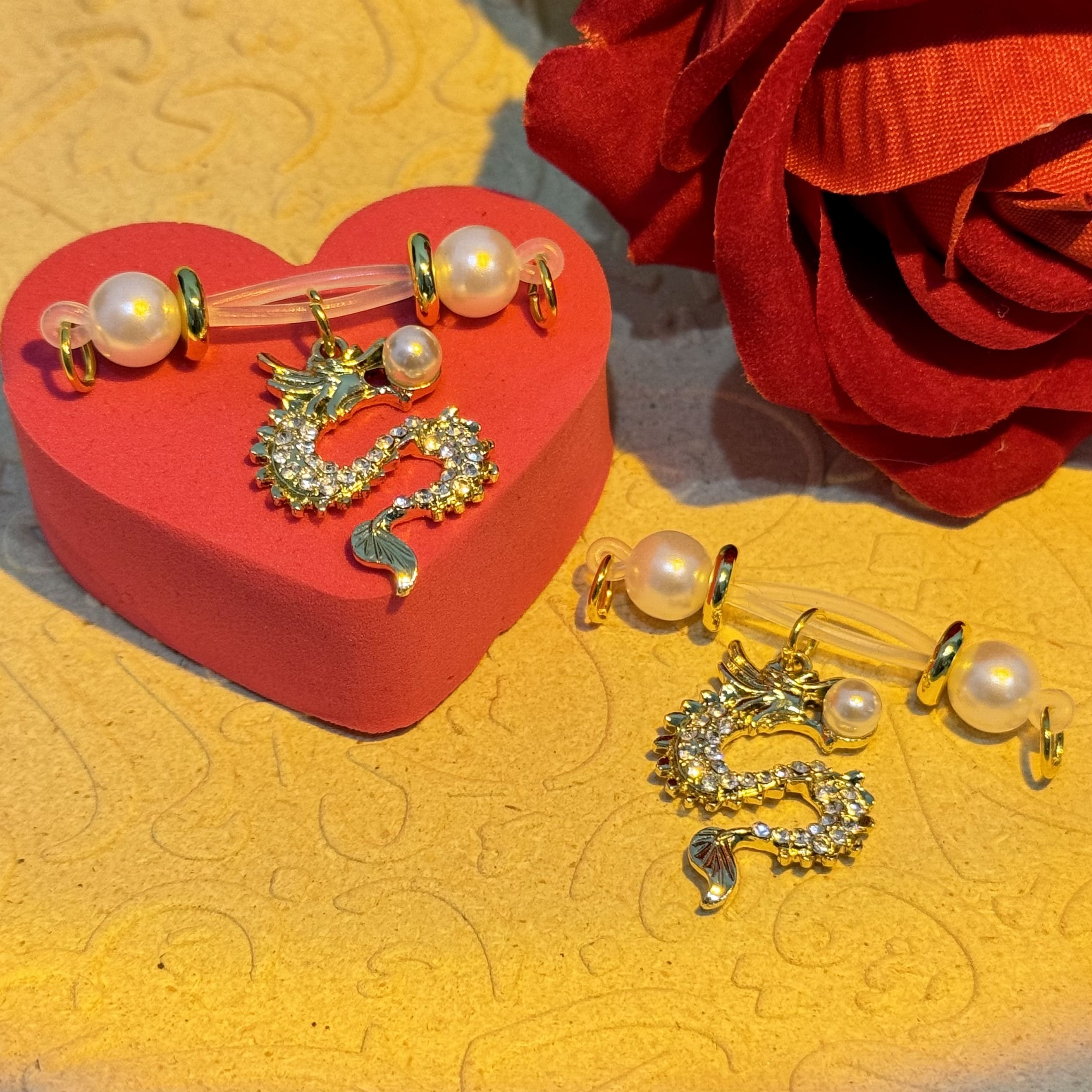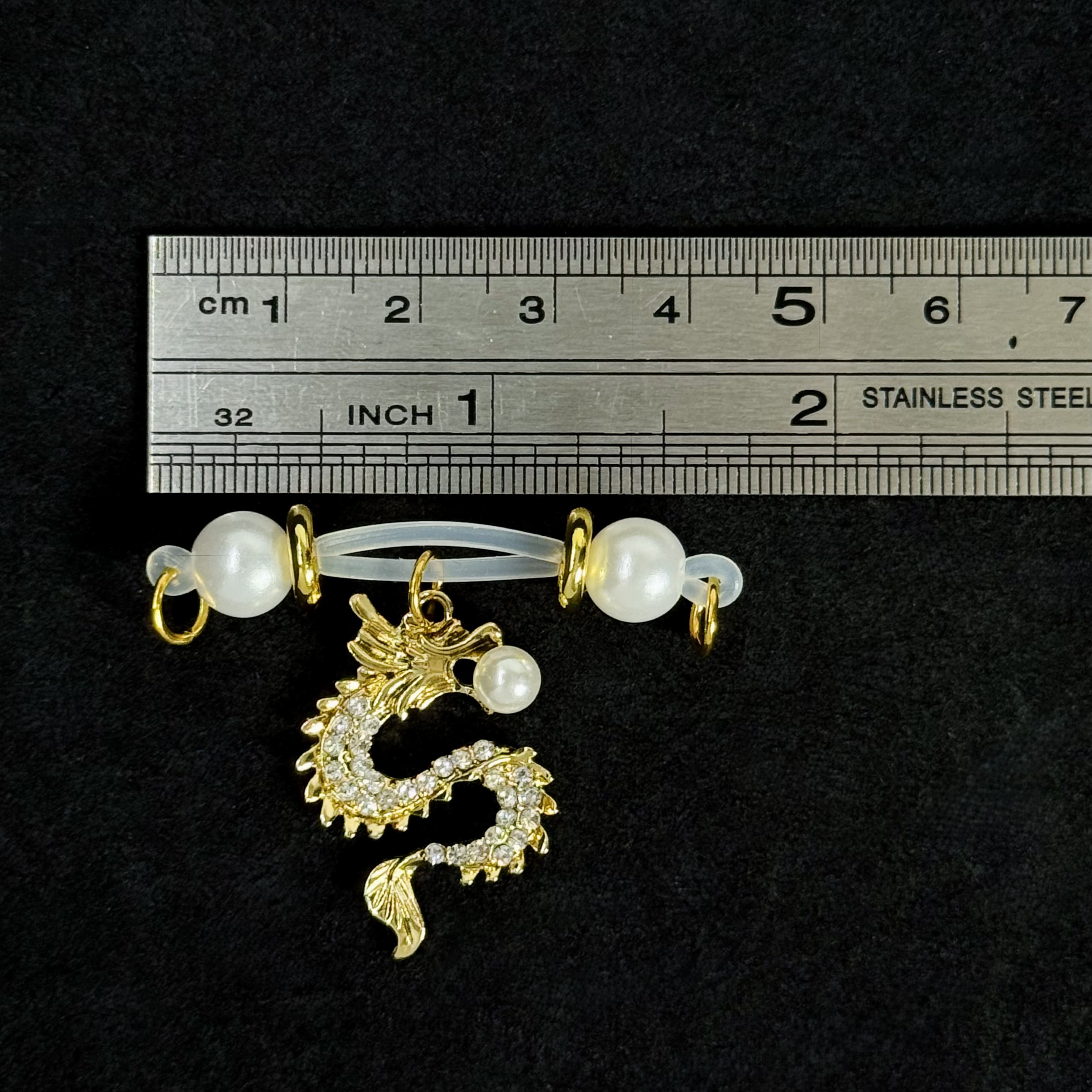 Luxurious gold-tone nipple clamp adorned with smooth pearls and a crystal dragon charm. Adjustable silicone ring ensures gentle grip, lightweight balance, and soothing comfort, creating an elegant, confident wearing experience.