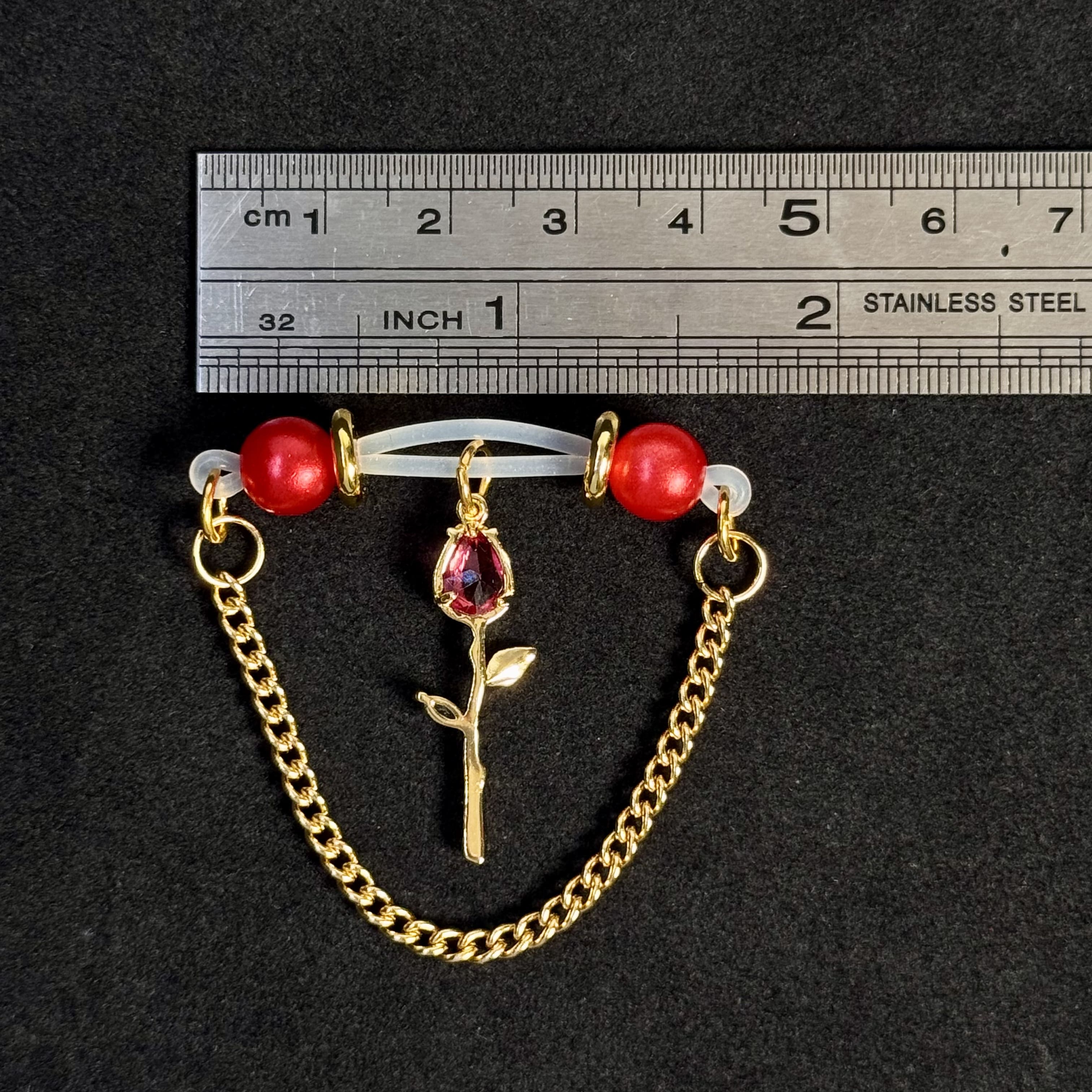 Elegant rose-themed nipple chains—glossy red beads, gold-plated rose pendants, and smooth silicone rings. Luxe yet comfy, these delicate pieces blend charm with ease, perfect for subtle allure.