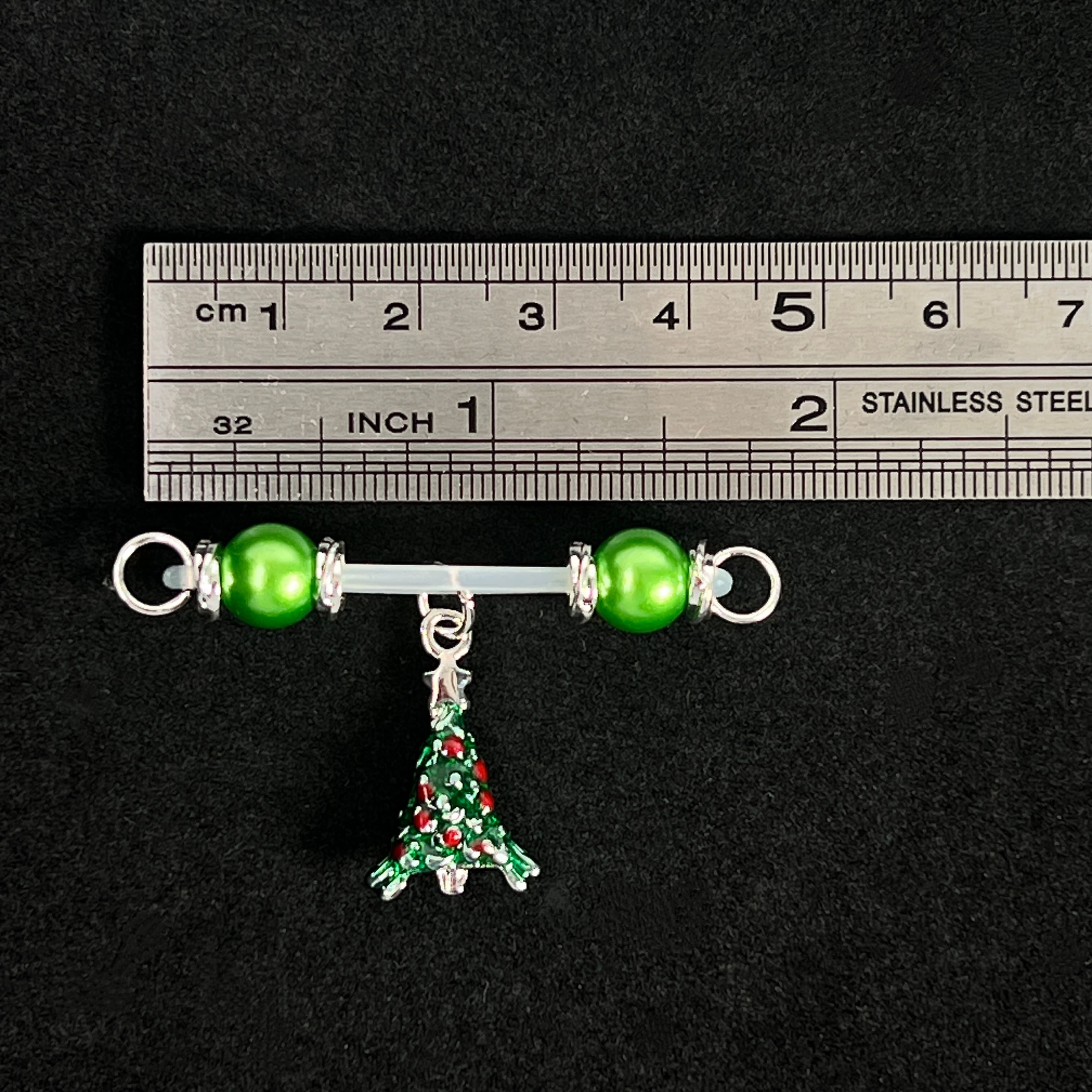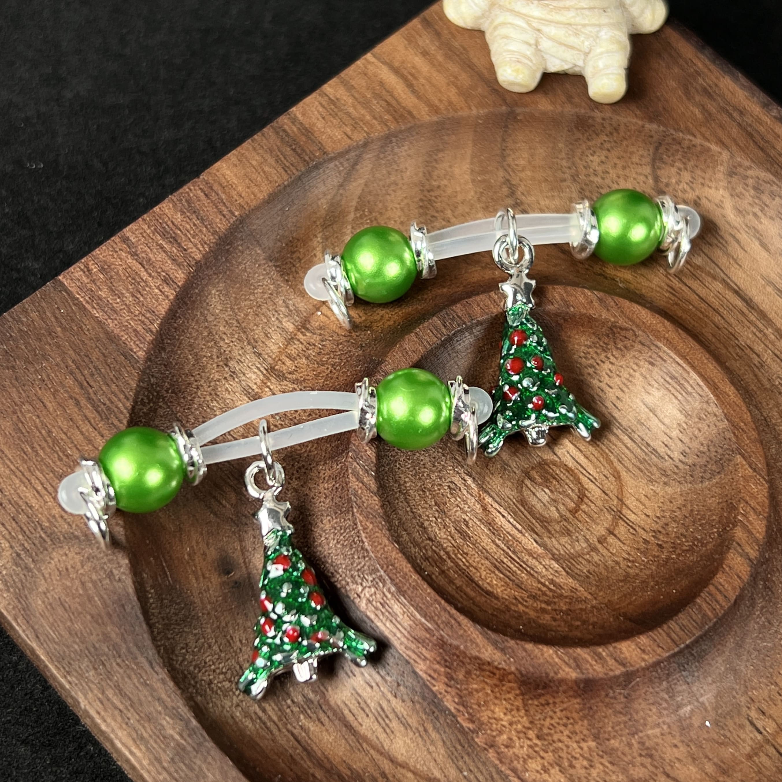 A sleek men’s adjustable nipple clamp featuring a green round-bead barbell paired with a green Christmas-tree charm. Designed for masculine style with controlled tension and smooth comfort. A refined, distinctive accessory that adds subtle edge and festive character.