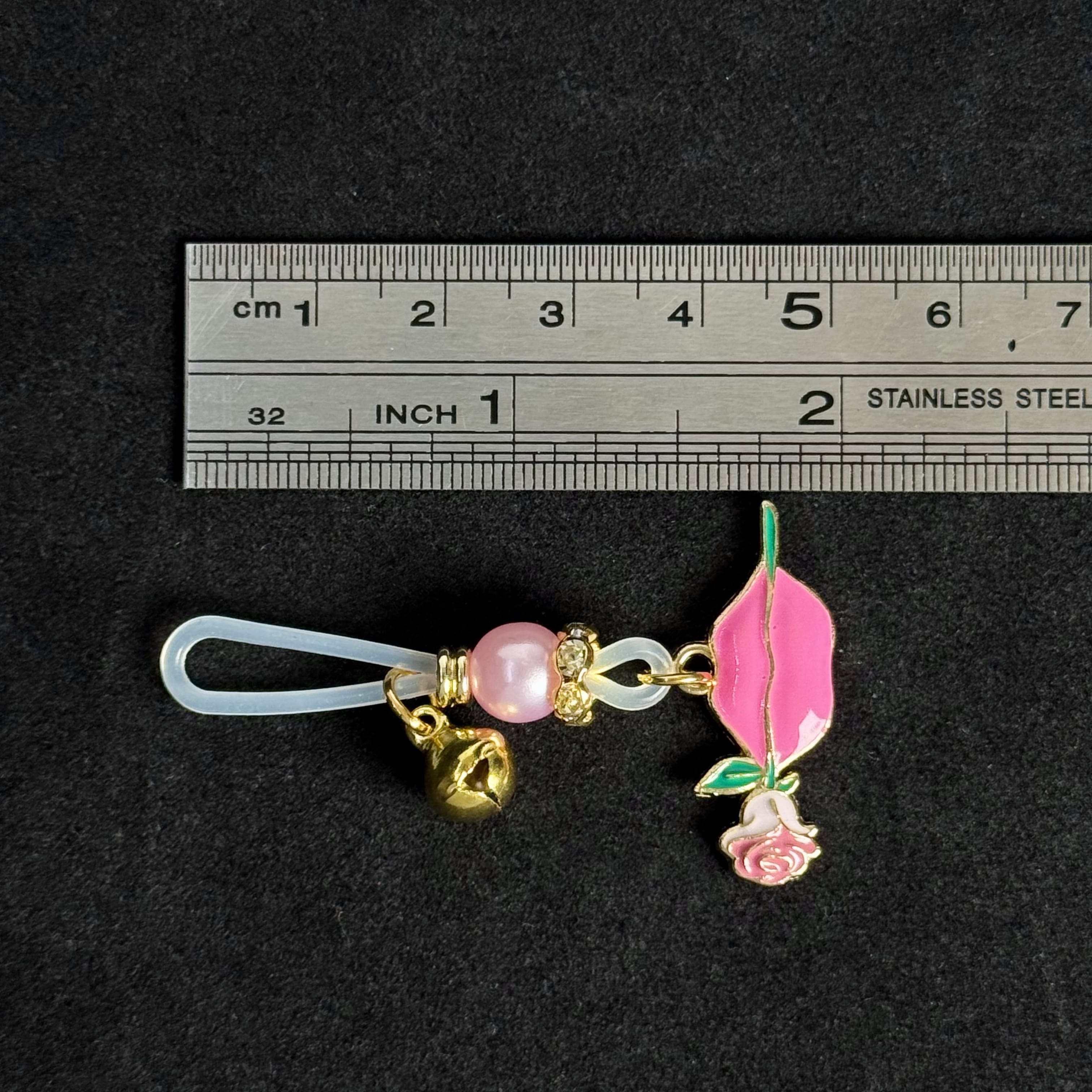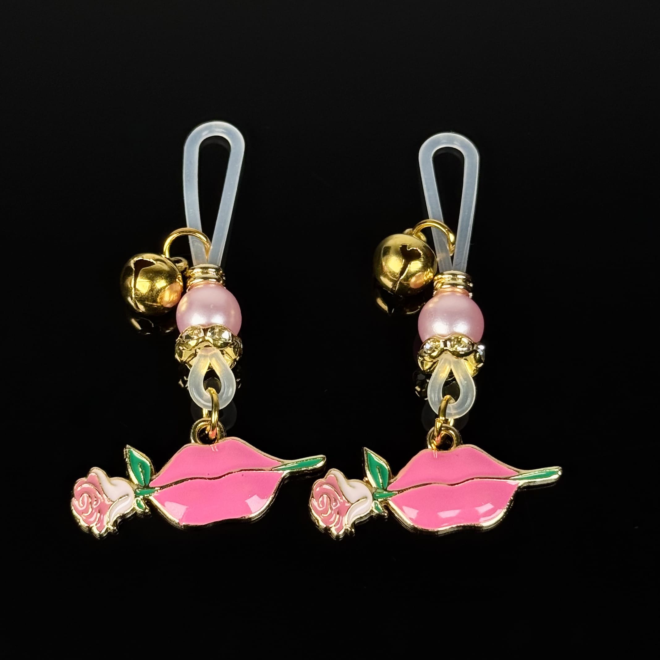 Luxe accessory: silky silicone bands, lustrous pink pearls, gold bells, and enamel lip-rose pendants. Lightweight, gentle—chic comfort for effortless daily glamour.