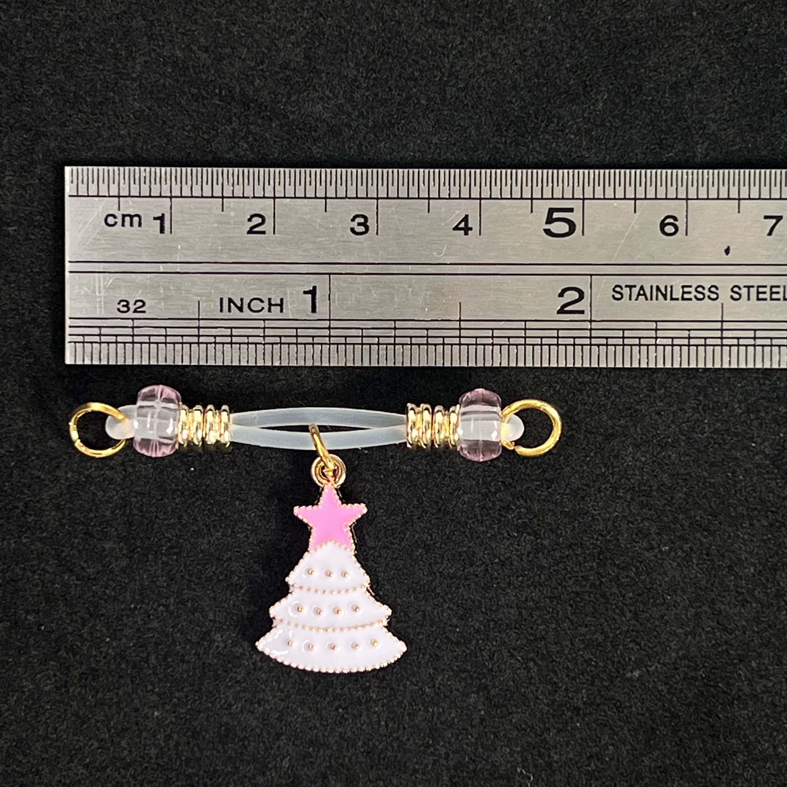 This barbell-style piece features a translucent bead paired with a pink Christmas tree and star pendant, blending festive charm with elegant design. The adjustable nipple clips ensure a comfortable, personalized fit, creating a delicate yet playful accent—perfect for adding a subtle holiday-inspired touch.
