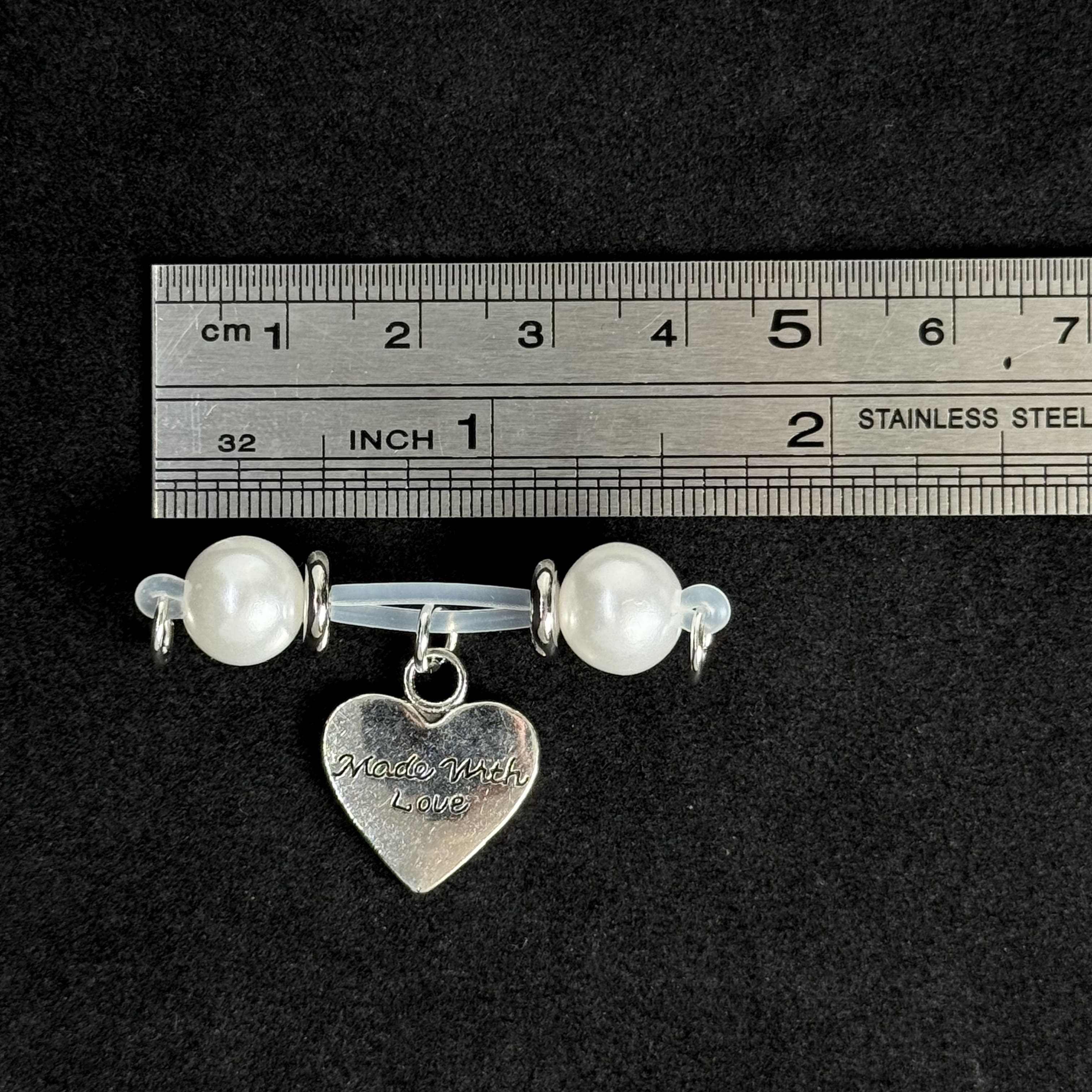 Luxurious nipple clamps featuring lustrous pearl beads and silver heart pendants engraved with “Made With Love”. Soft silicone bands ensure a gentle, secure fit for romantic comfort.