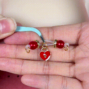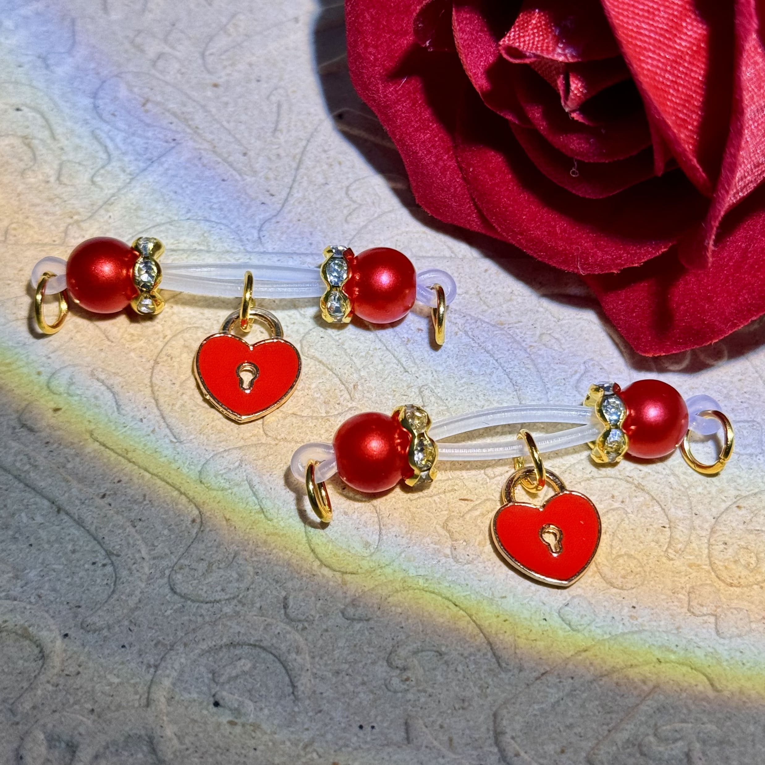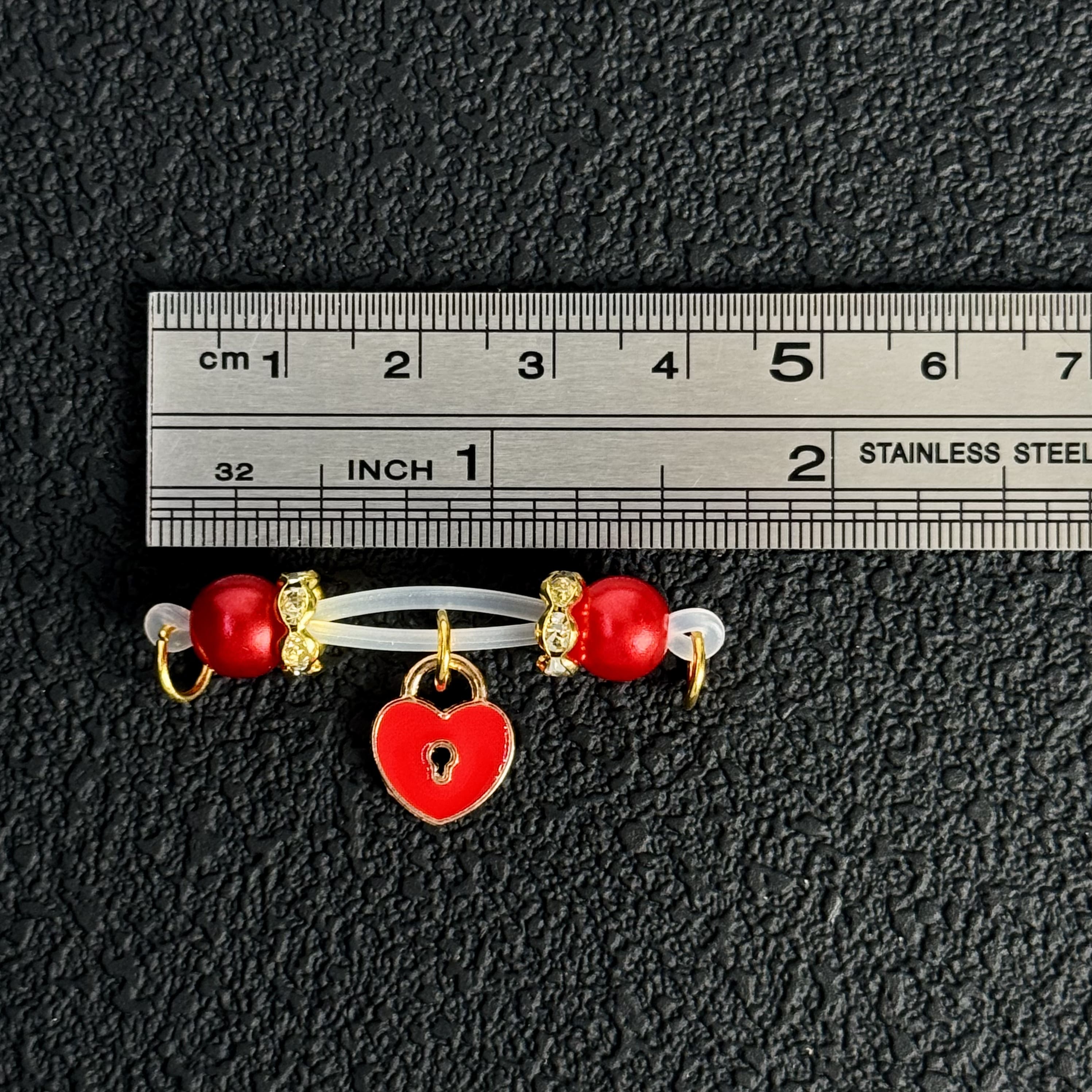 These opulent heart-lock nipple clamps feature smooth silicone bands, lustrous red beads, and a refined enamel charm, offering a gentle, snug hold for a luxuriously comfortable experience.