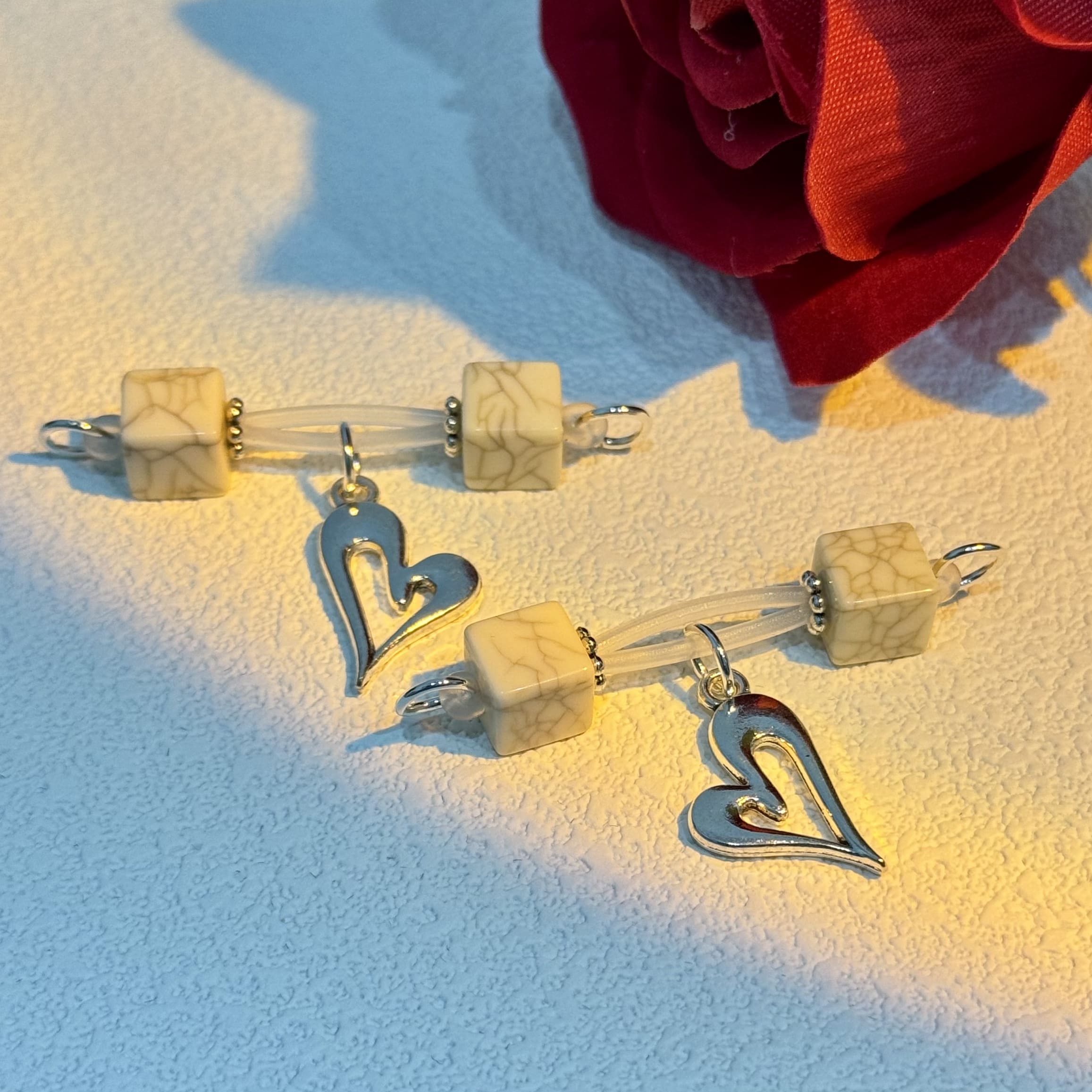 Sophisticated nipple clamps with veined cream cube beads and sleek silver heart pendants. Soft silicone bands ensure a gentle, secure fit for refined comfort and romantic charm.
