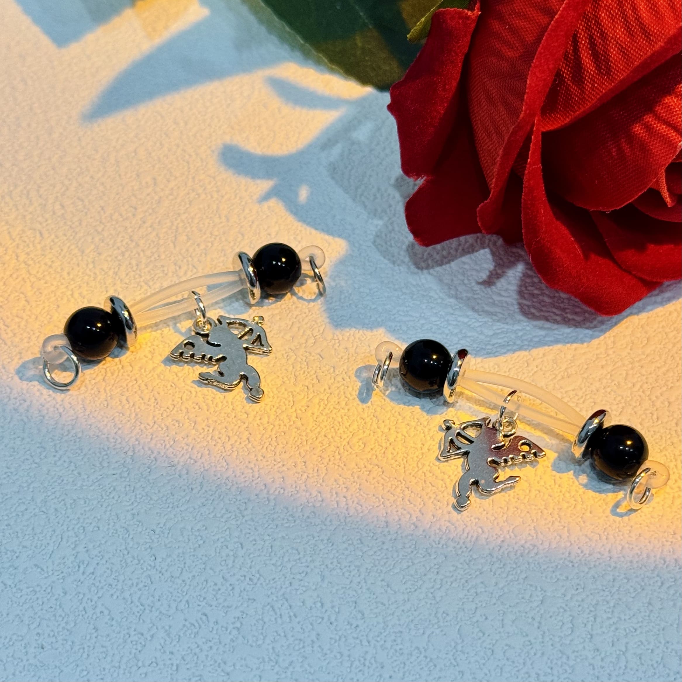 Luxe nipple clamps with sleek black beads and silver Cupid pendants. Soft silicone bands ensure a gentle, secure fit for romantic allure and lasting comfort.
