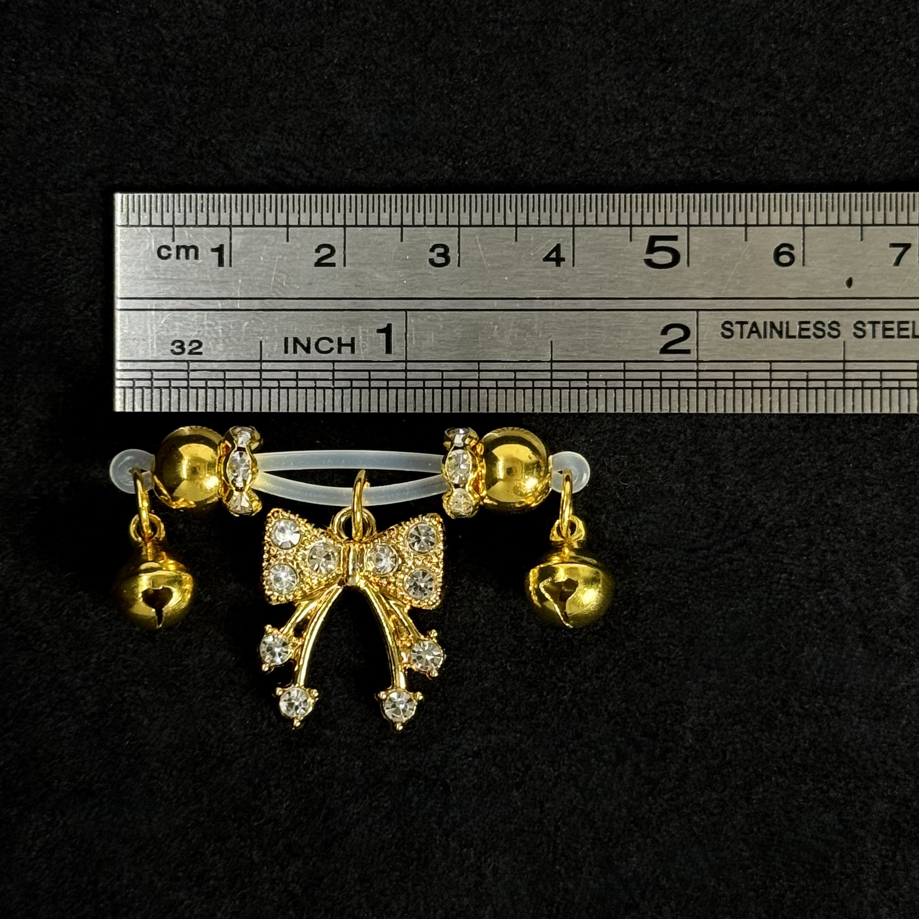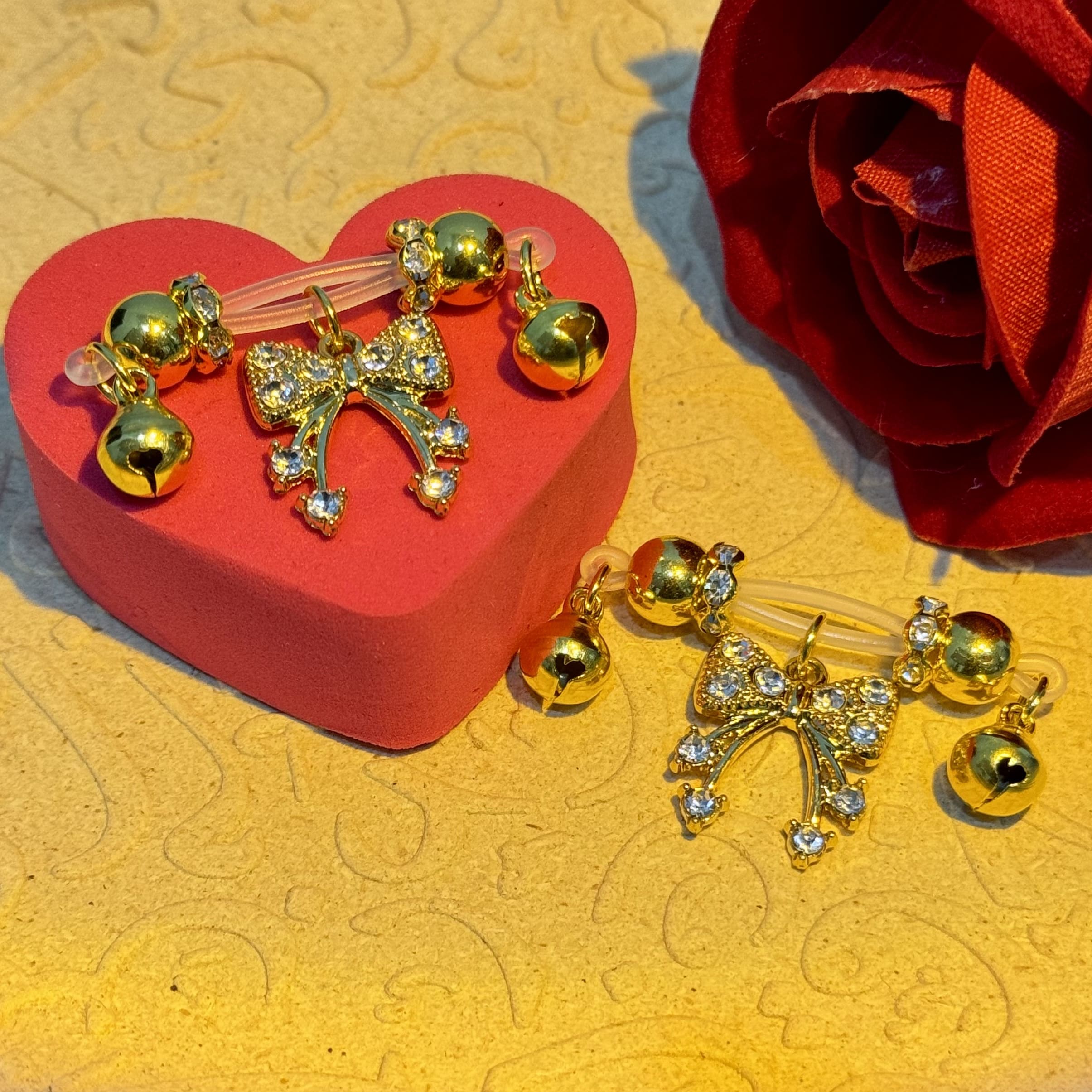 Elegant gold-tone nipple clamp featuring adjustable silicone rings, delicate bow charm, and soft bell accents. Lightweight, secure, and skin-friendly, it delivers gentle pressure and all-day comfort—perfect for refined intimate styling with confidence.
