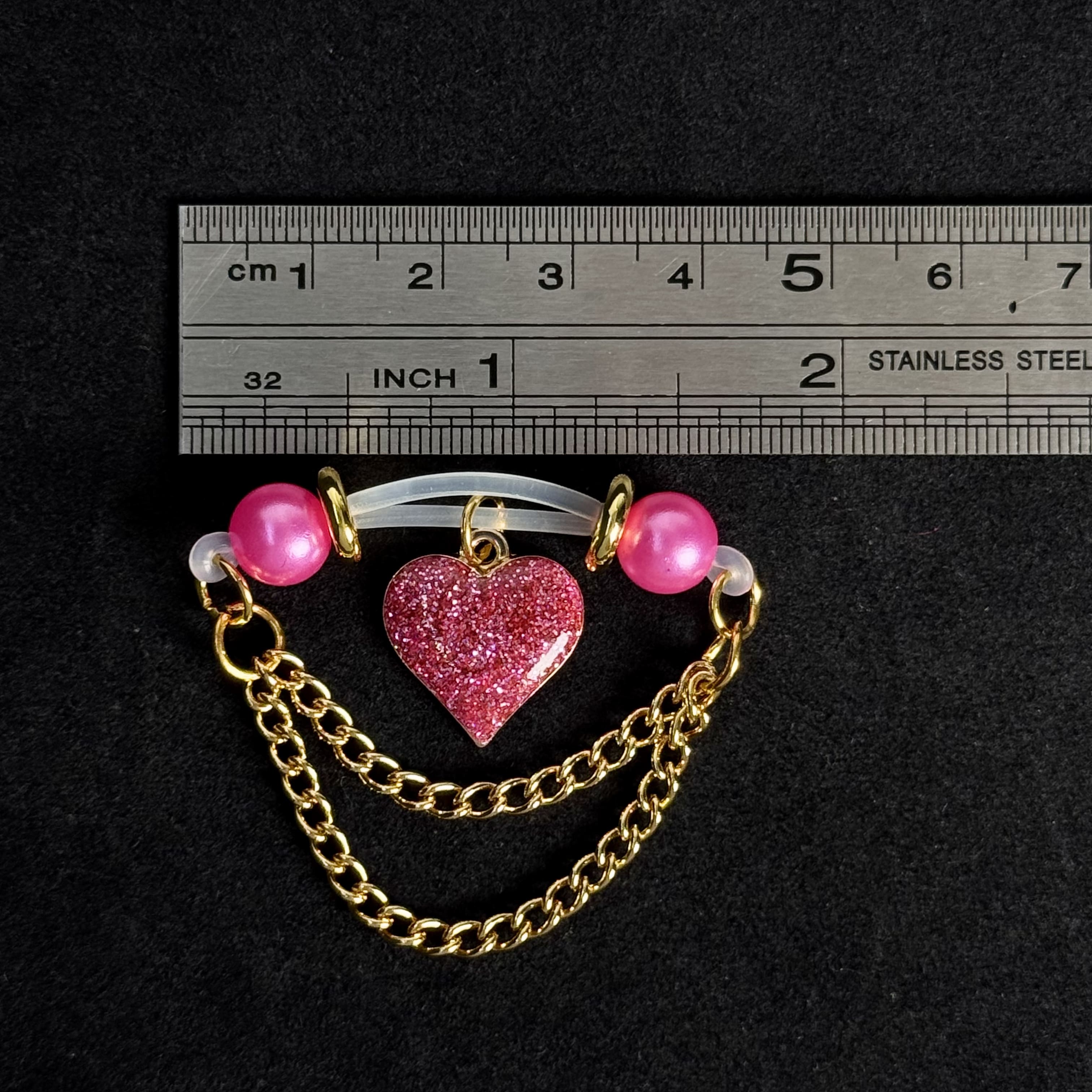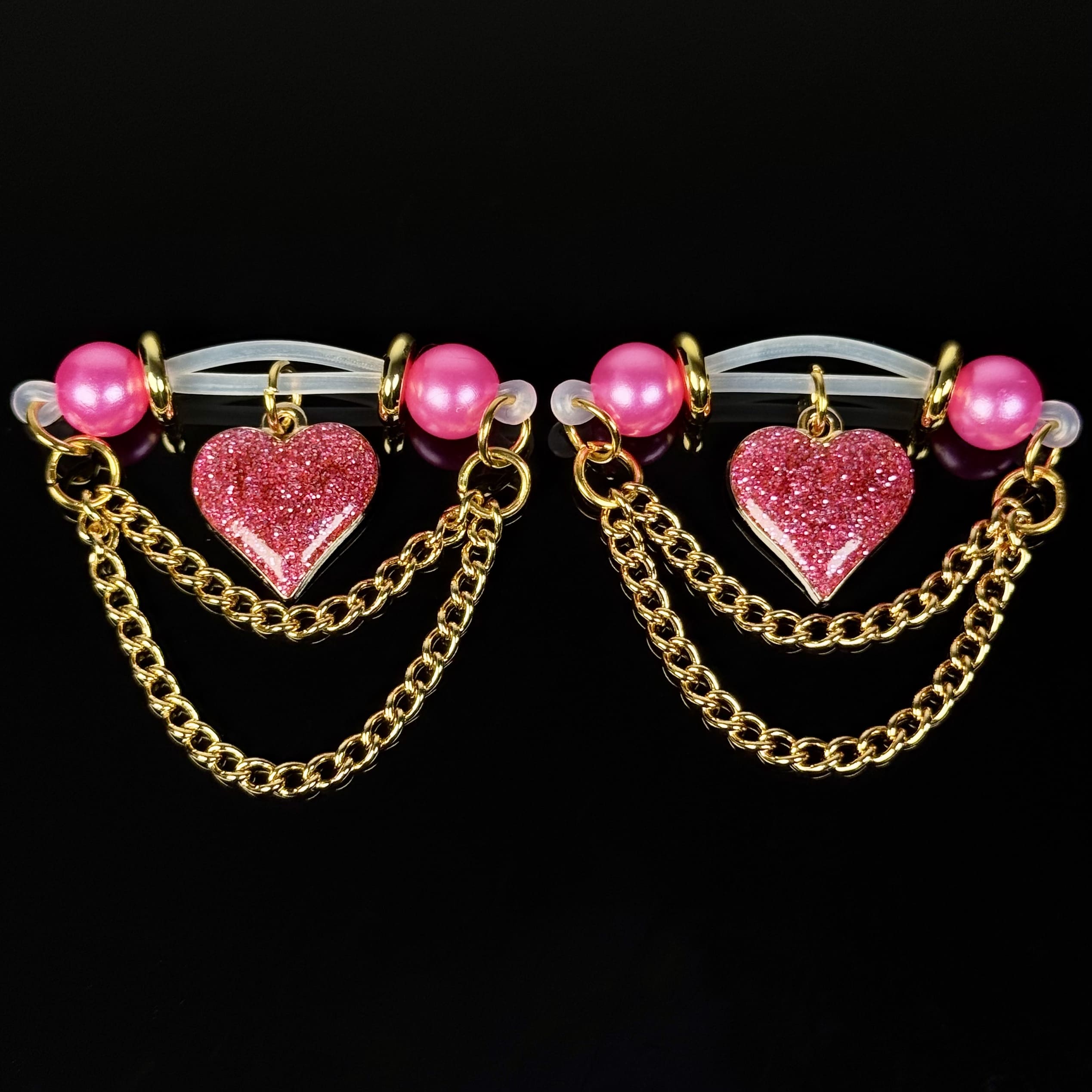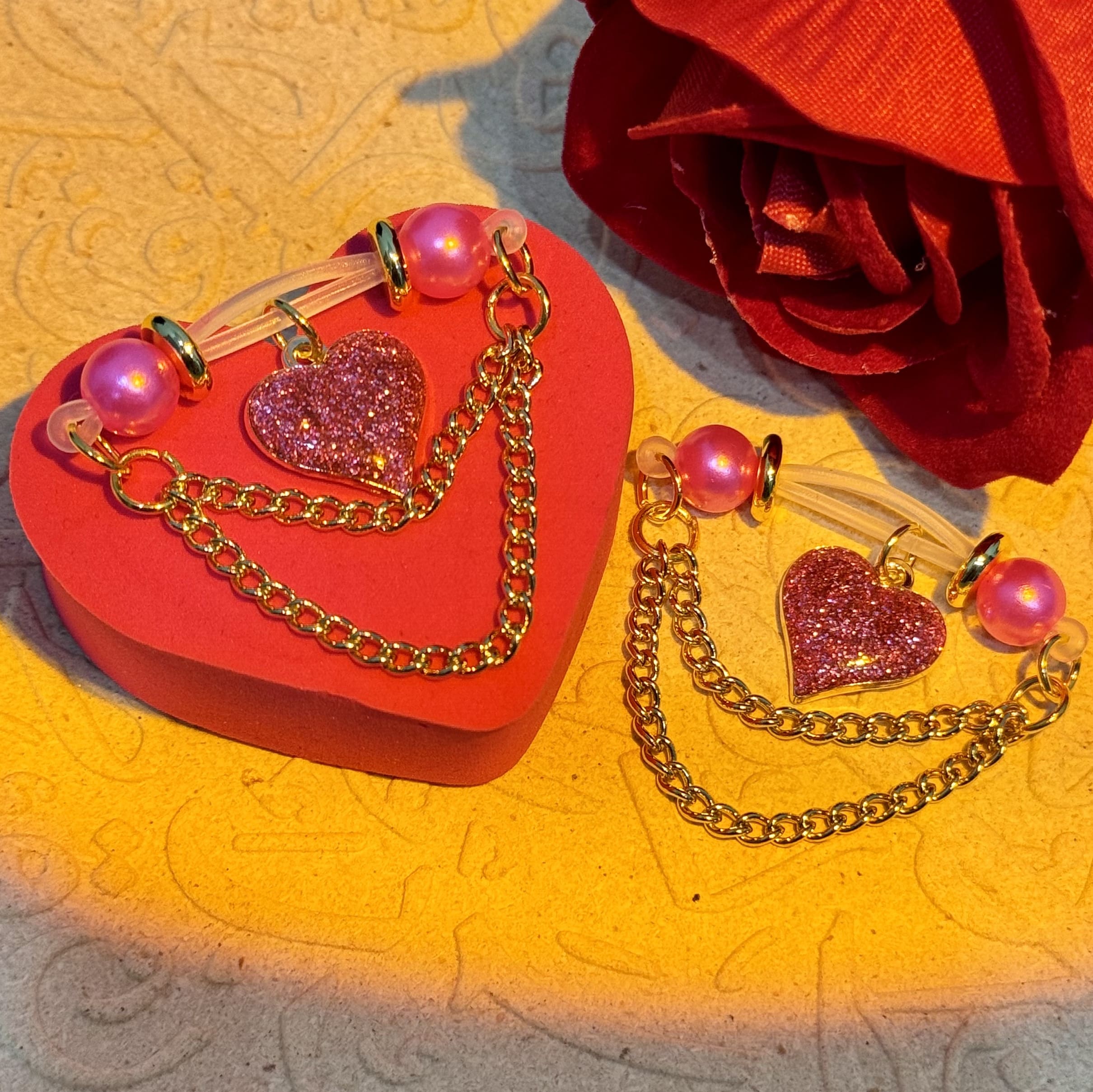 Luxe hair accessory: glossy pink pearls, sleek silicone bands, glittering heart pendants, and layered gold chains. Lightweight, gentle—effortless glamour for cozy, chic styling.