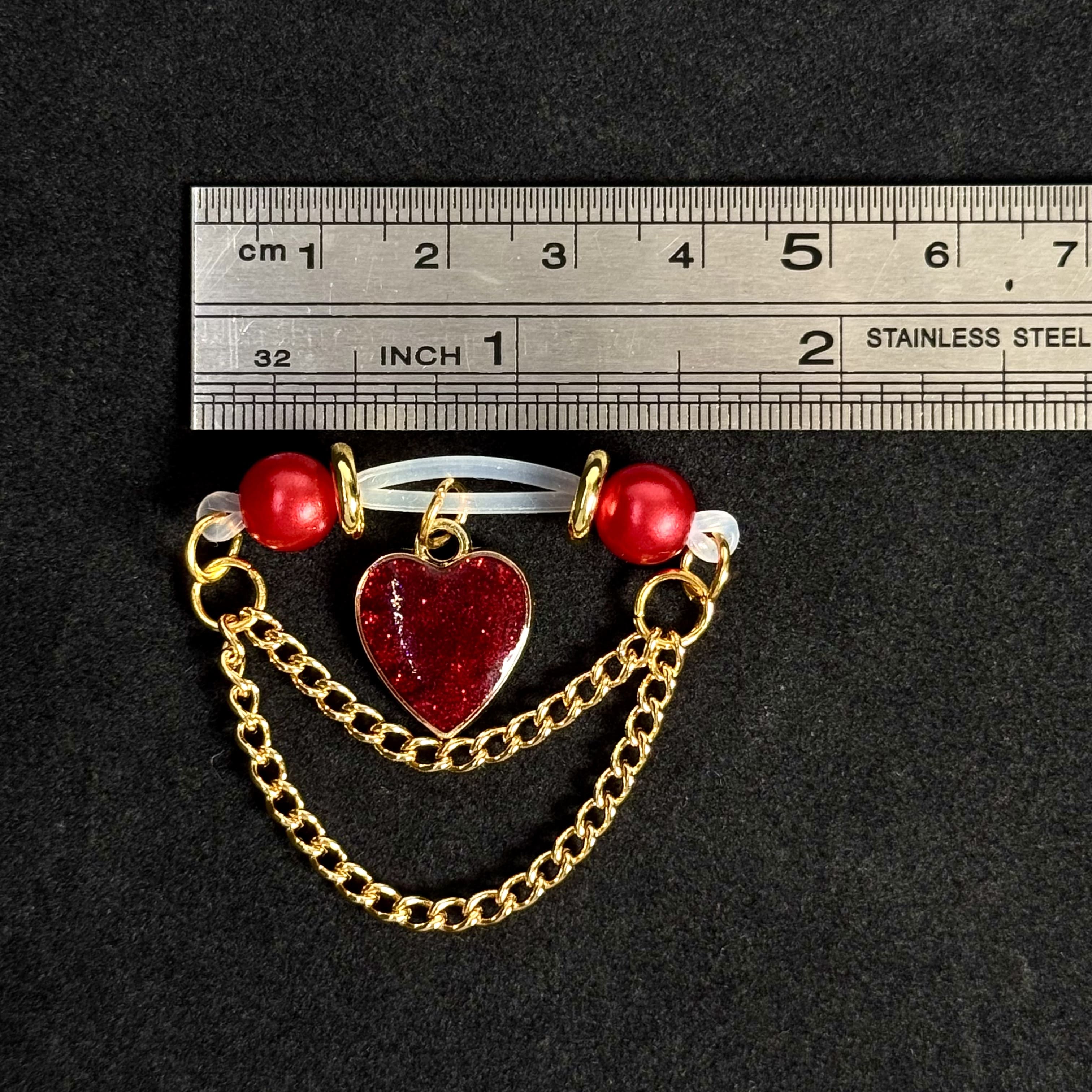 Clear bar, glossy red beads, glitter heart set in gold chains—polished, not tacky. The layered links add subtle luxury; every detail feels intentionally sleek.