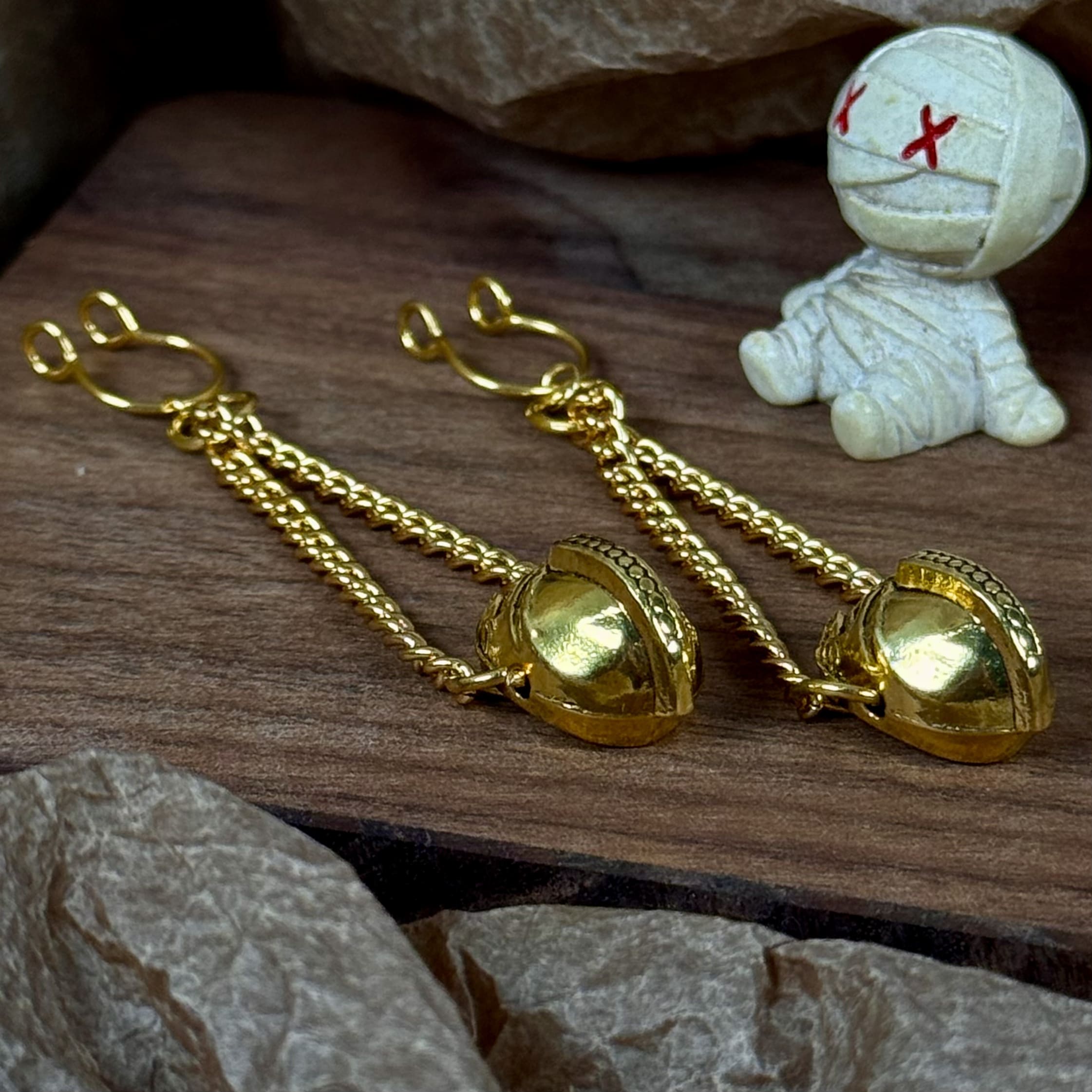 This gold horseshoe-style adjustable nipple clamp features a warm metallic finish paired with a gold chain and helmet charm, delivering a bold, refined aesthetic. The adjustable tension ensures secure, comfortable wear, expressing understated yet distinctive masculine style.