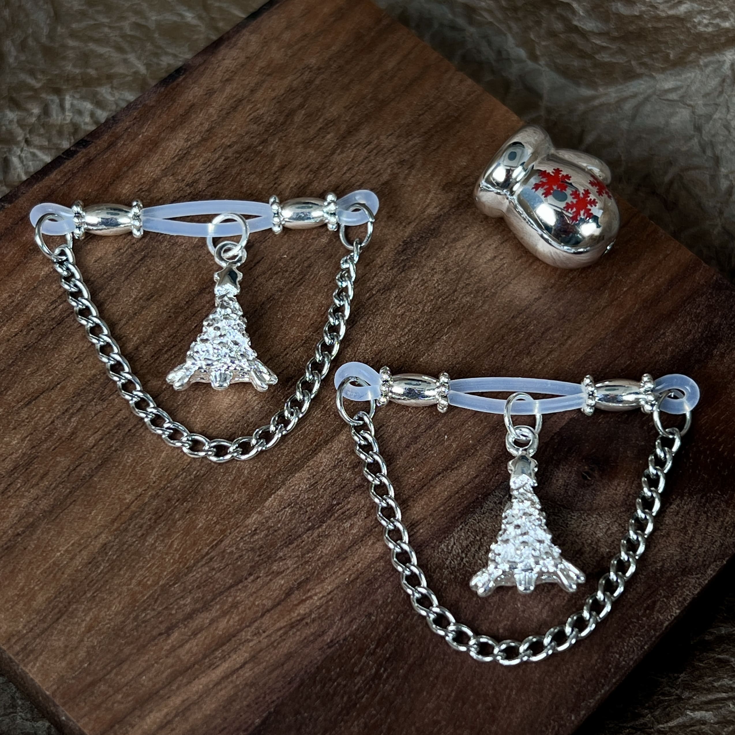 A polished men’s adjustable nipple clamp featuring a silver olive-shaped barbell bead, paired with a silver Christmas-tree charm and sleek chain. Designed for a clean, masculine aesthetic with controlled tension and smooth comfort. A refined accessory that adds subtle edge and festive style.