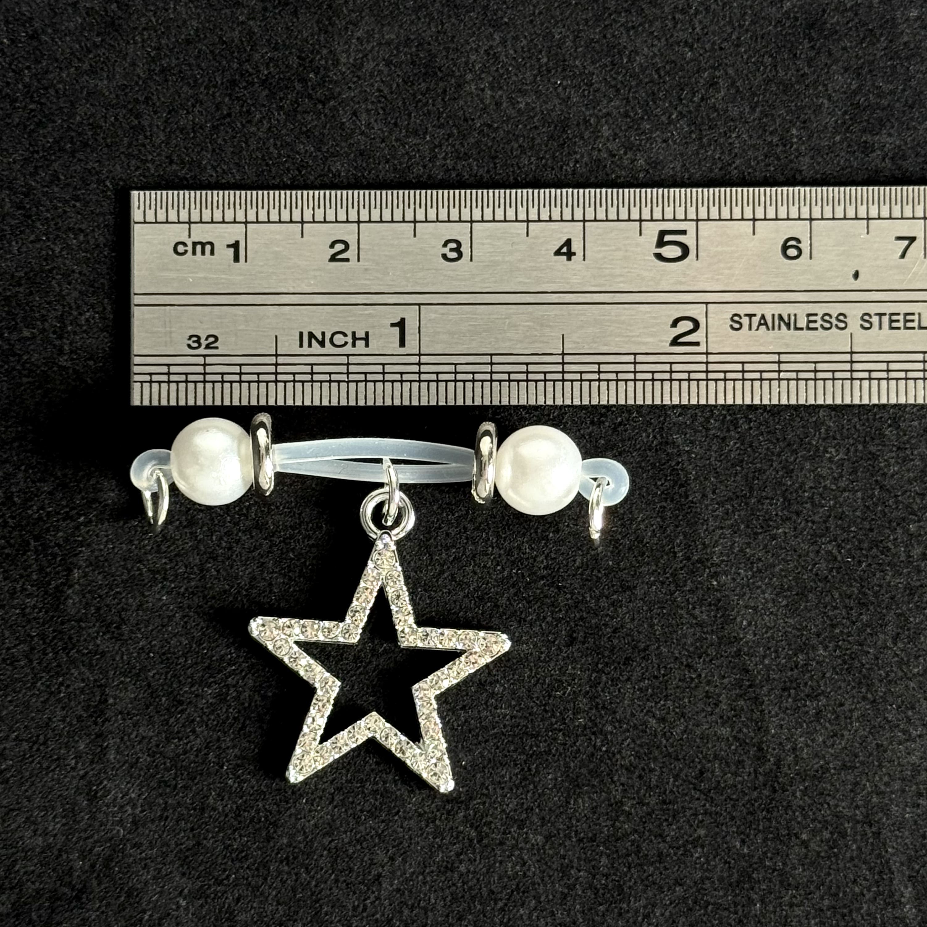 Luxe nipple clamps featuring luminous pearls and glittering star pendants. Soft silicone bands deliver a gentle, secure fit for celestial comfort and glamorous allure.